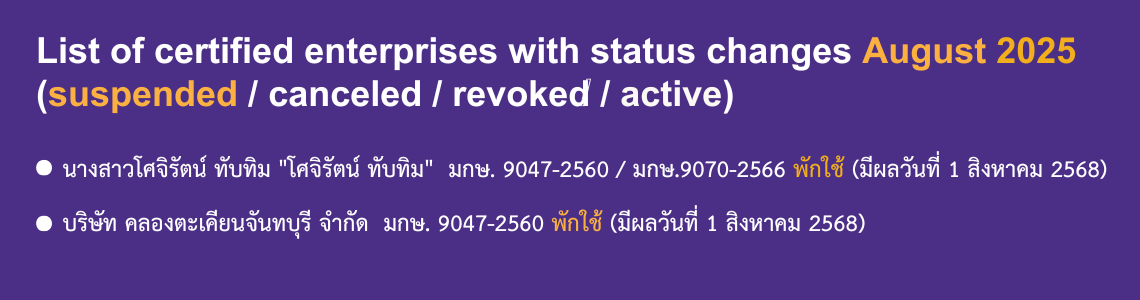 รายชื่อสถานประกอบการที่ได้รับการรับรองที่มีการเปลี่ยนแปลงสถานะ ประจำเดือนสิงหาคม (พักใช้/ยกเลิก/เพิกถอน)