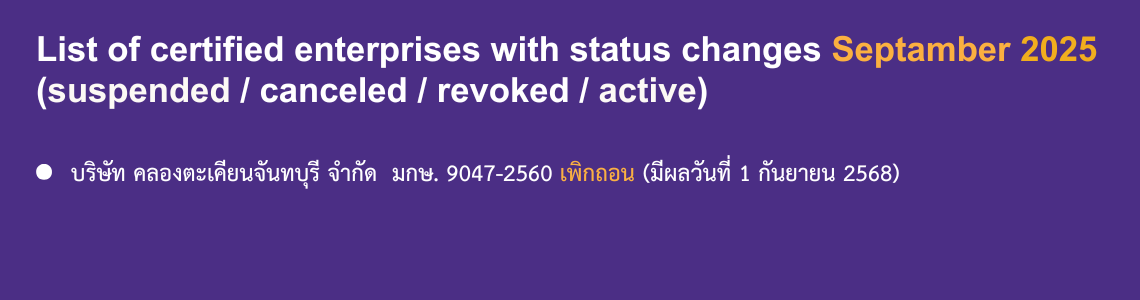 รายชื่อสถานประกอบการที่ได้รับการรับรองที่มีการเปลี่ยนแปลงสถานะ ประจำเดือนกันยายน (พักใช้/ยกเลิก/เพิกถอน)
