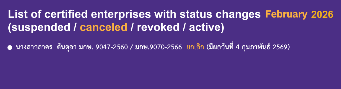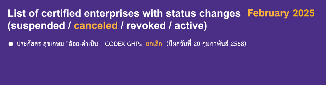 รายชื่อสถานประกอบการที่ได้รับการรับรองที่มีการเปลี่ยนแปลงสถานะ ประจำเดือนกุมภาพันธ์ (พักใช้/ยกเลิก/เพิกถอน)