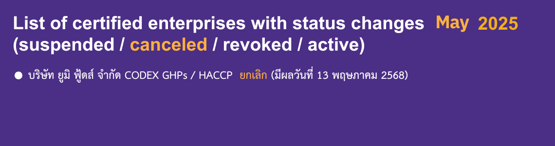 รายชื่อสถานประกอบการที่ได้รับการรับรองที่มีการเปลี่ยนแปลงสถานะ ประจำเดือนพฤษภาคม (พักใช้/ยกเลิก/เพิกถอน)