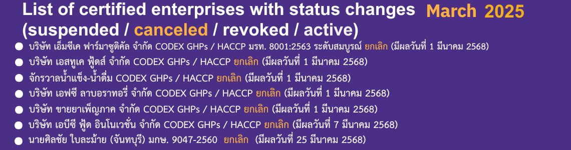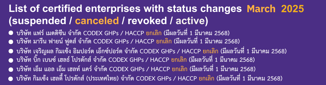 - บริษัท มารีน ฟายน์ ฟูดส์ จำกัด CODEX GHPs / HACCP ยกเลิก (มีผลวันที่ 1 มีนาคม 2568)
