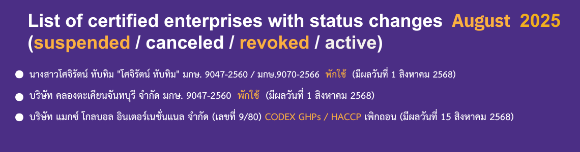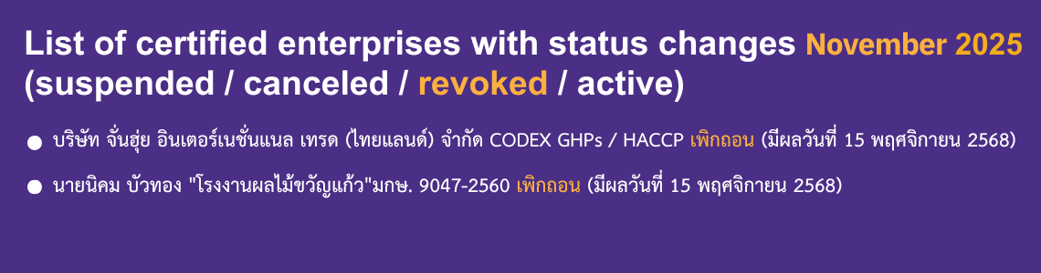 - บริษัท จั่นฮุ่ย อินเตอร์เนชั่นแนล เทรด (ไทยแลนด์) จำกัด CODEX GHPs / HACCP เพิกถอน (มีผลวันที่ 15 พฤศจิกายน 2568)