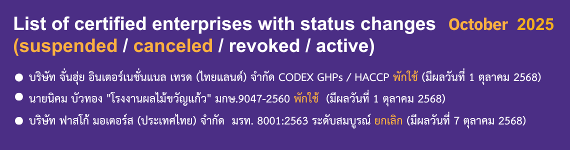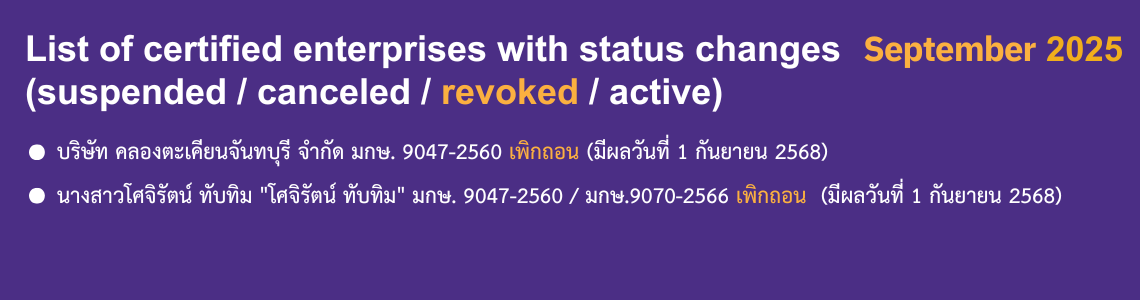 รายชื่อสถานประกอบการที่ได้รับการรับรองที่มีการเปลี่ยนแปลงสถานะ ประจำเดือนกันยายน (พักใช้/ยกเลิก/เพิกถอน)