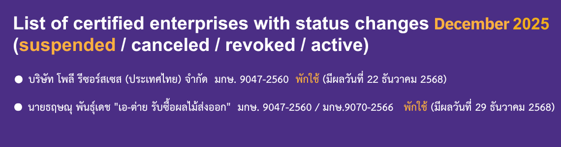 - นายธฤษณุ พันธุ์เดช “เอ-ต่าย รับซื้อผลไม้ส่งออก” มกษ. 9047-2560 / มกษ.9070-2566 พักใช้ (มีผลวันที่ 29 ธันวาคม 2568)