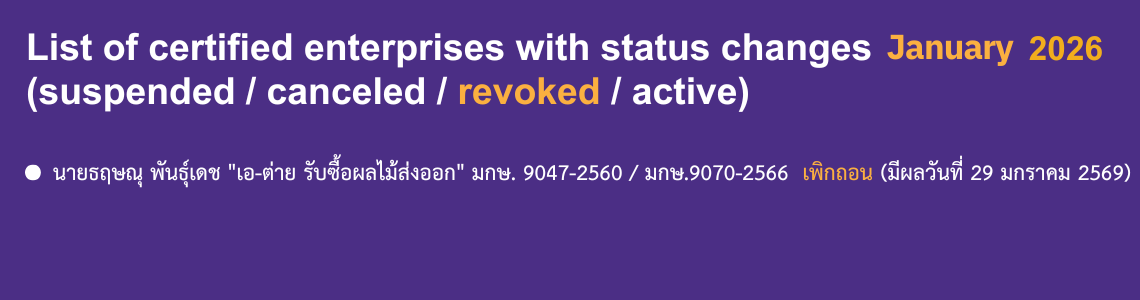 - นายธฤษณุ พันธุ์เดช “เอ-ต่าย รับซื้อผลไม้ส่งออก” มกษ. 9047-2560 / มกษ.9070-2566 เพิกถอน (มีผลวันที่ 29 มกราคม 2569)