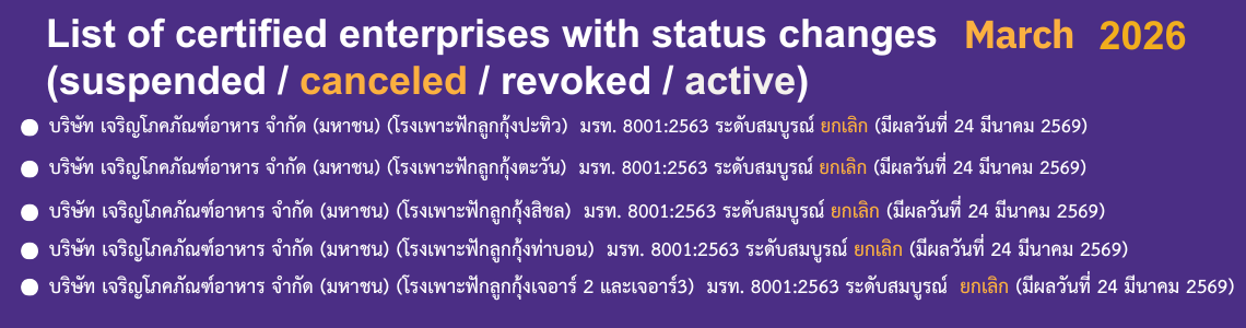 - บริษัท เจริญโภคภัณฑ์อาหาร จำกัด (มหาชน) (โรงเพาะฟักลูกกุ้งสิชล) มรท. 8001:2563 ระดับสมบูรณ์ ยกเลิก (มีผลวันที่ 24 มีนาคม 2569)